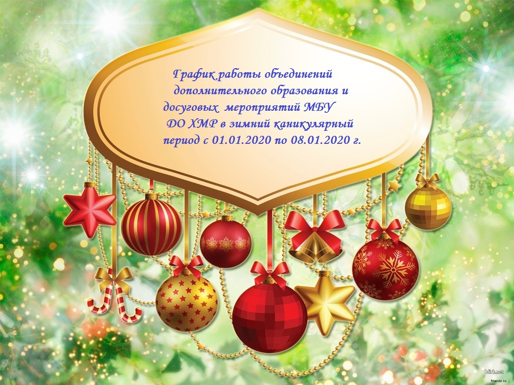 Уважаемые обучающиеся, родители! Сообщаем Вам что, в разделе "Объявления" размещен График работы объединений дополнительного образования и досуговых мероприятий муниципального бюджетного учреждения дополнительного образования Ханты-Мансийского района в зимний каникулярный период с 01.01.2020 по 08.01.2020 года