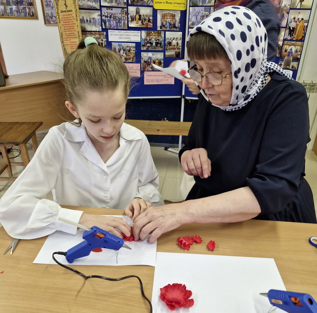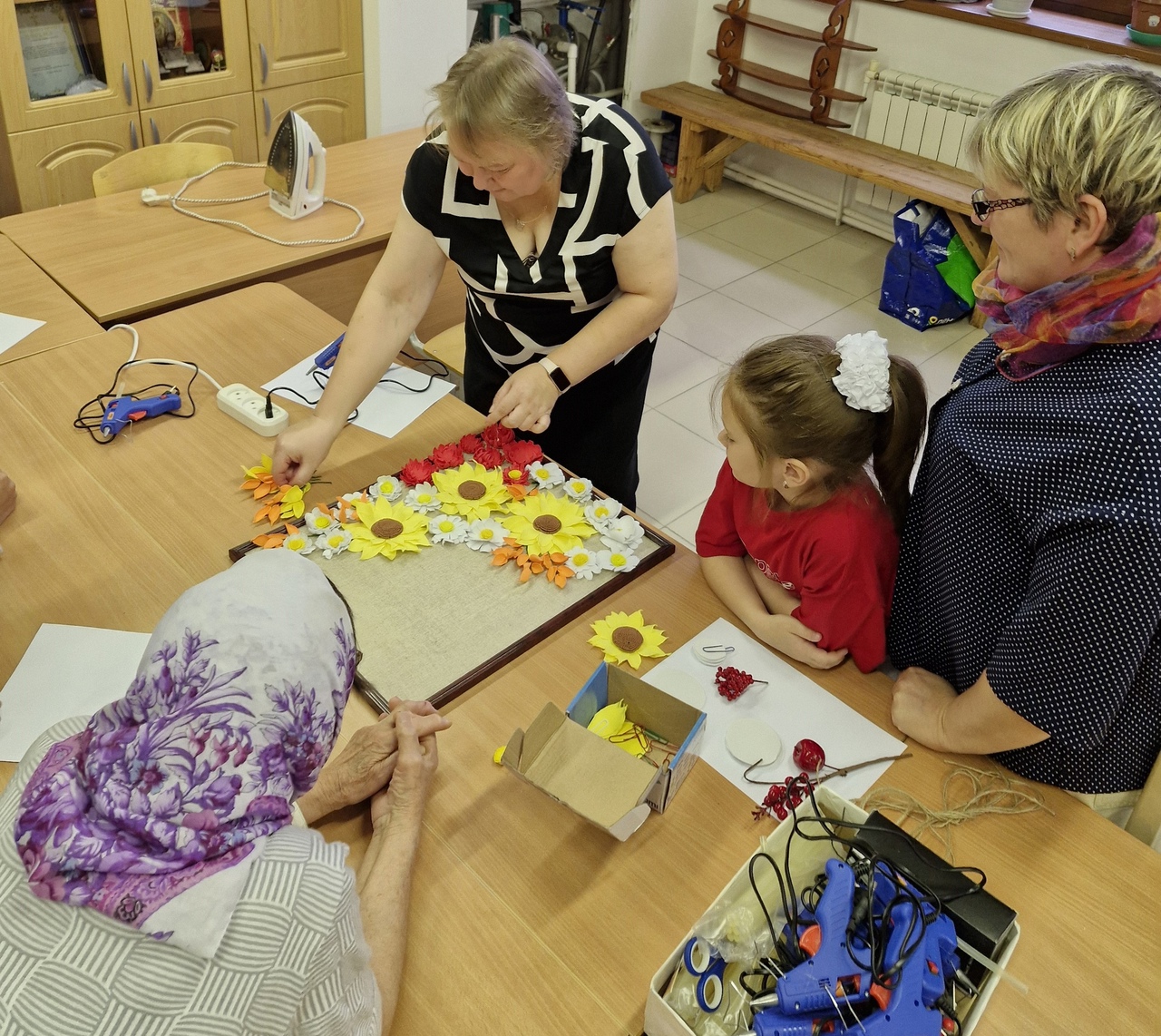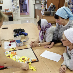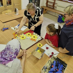 После выступления состоялся мастер-класс «Золотая осень жизни», организованный педагогами дополнительного образования Васильевой Мариной Михайловной и Коневой Викторией Анатольевной. На мастер-классе дети и прихожане поселка Луговской смогли создать потрясающее панно в технике объемной аппликации из фоамирана.