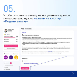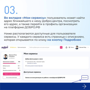 Воспользоваться любым из видов оказываемой помощи теперь можно всего лишь в 2 клика: достаточно зайти на платформу ДОБРО.РФ и во вкладке «Мои сервисы» выбрать услугу ближайшего к Вам Добро.Центра.