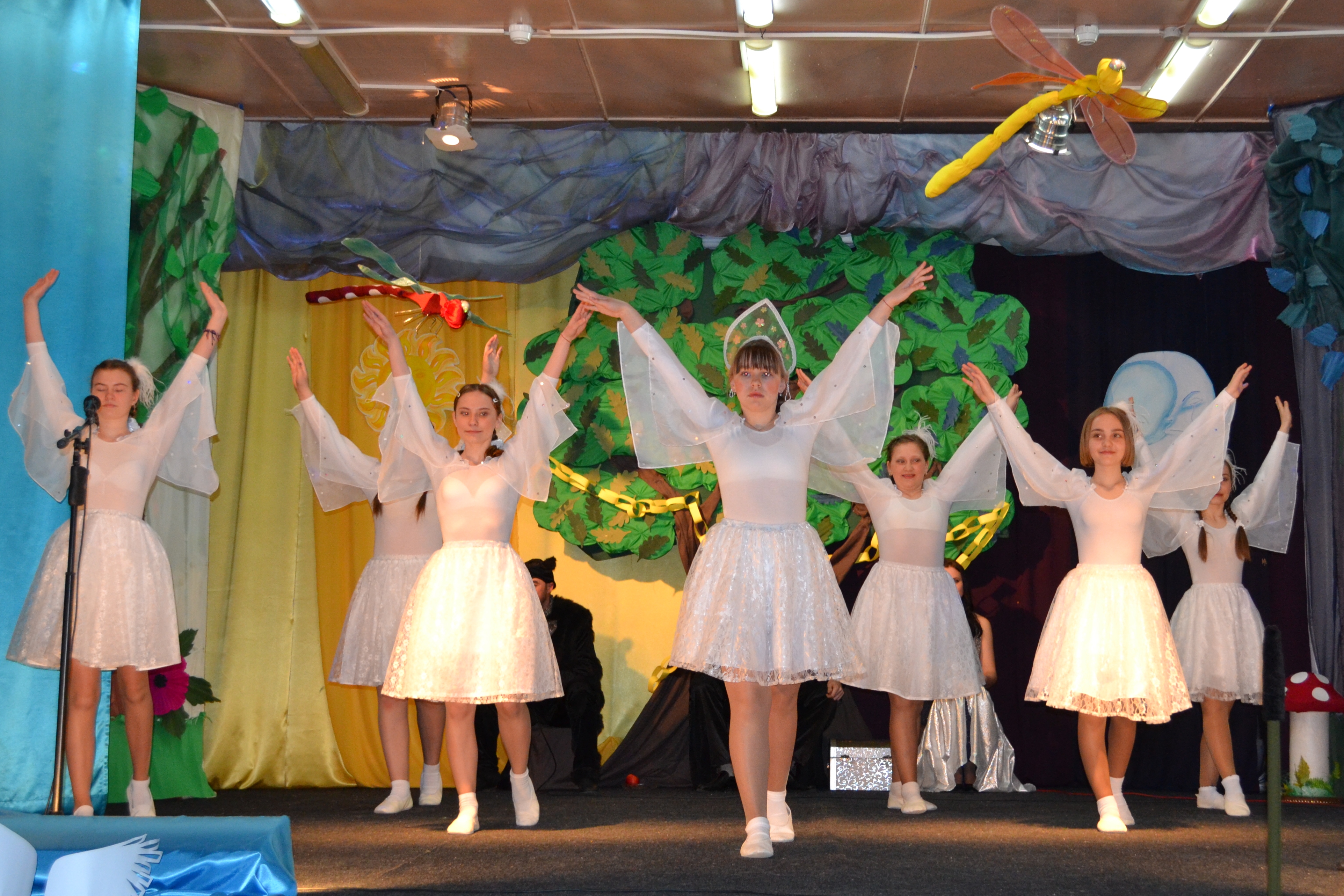 В отчетном концерте «Переполох в Лукоморье»приняли участие более 80 обучающихся творческих объединений: «В ритме танца», педагог Рясная Валерия Павловна, «Танцевальный рай», педагог Кошелева Марина Арисовна, вокальные номера, педагог КандыказаковаЗауреш Эдуардовна, а также обучающиеся и педагоги в главных ролях: Цыбуляк Олег Сергеевич (Кот ученый), Кошелева Анна Александровна (Русалка), Акиньшин Иван (Кощей Бессмертный), Щербина Мария (Баба-Яга), красавицы-принцессы: Дюймовочка (Козлова Анна), Царевна-Лебедь (Веретельникова Ксения), Шамаханская царица (Джентемирова Бэла), Золушка (Пуртова Дарья), Белоснежка (Пуртова Юлия), Цыбуляк Максим, Кугаевский Иван, Муравенко Владимир (трехголовый дракон). Занимательный сюжет, яркие танцевальные и вокальные номера, замечательные костюмы, неподдельные эмоции зрителей и талантливая игра главных героев – вот слагаемые прекрасного концерта. А еще, конечно же, мастерство и творчество руководителей коллективов, настоящих профессионалов своего дела, замечательных педагогов.