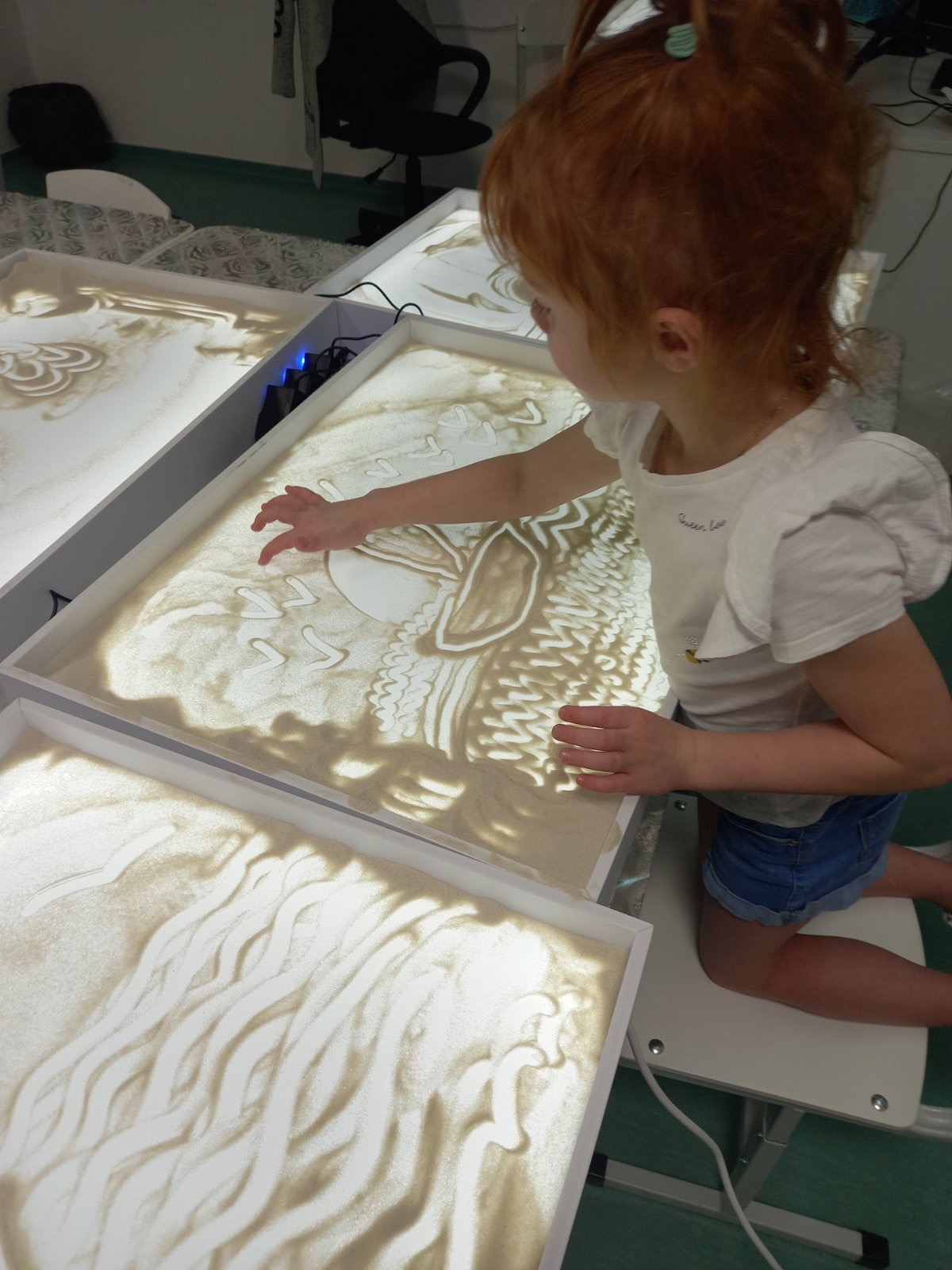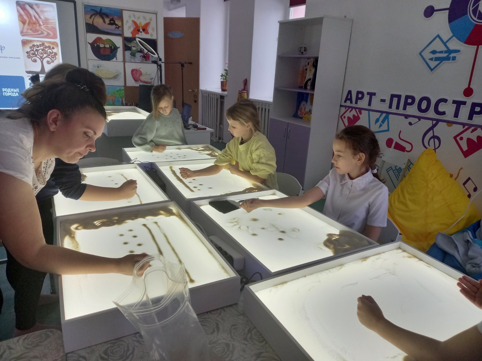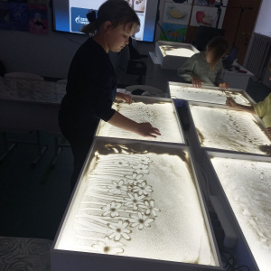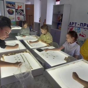 С сентября по ноябрь в новой студии организованы и проведены ряд мероприятий цикла "Песочная фантазия", в которой приняли участие обучающиеся объединения дополнительного образования "Изостудия "Юный художник", а также все желающие ребята. Здесь они познакомились с техникой рисования на песке, отработали упражнения, благодаря которым смогли нарисовать свои первые рисунки и самореализоваться в других продуктах творчества - рисунках, аппликациях, композициях, игрушках и др.