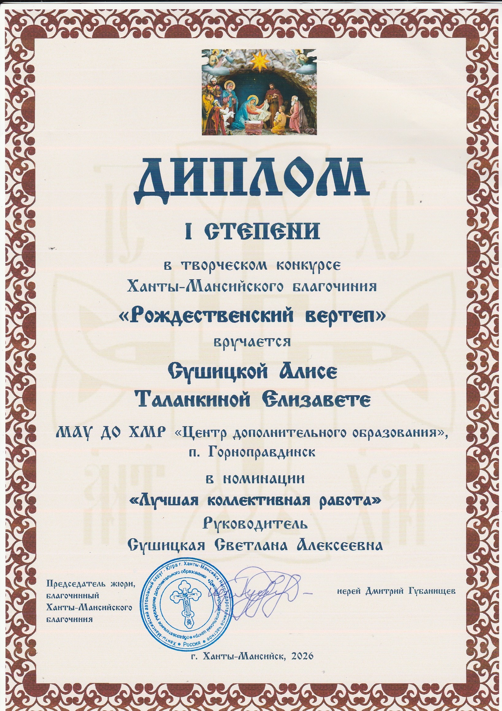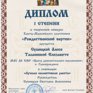 поддержать совместное творчество детей, родителей и педагогов, укрепляя семейные и общинные связи.Конкурс объединил школы, воскресные школы, центры дополнительного образования и семейные коллективы, дав каждому возможность выразить своё видение рождественской истории в художественных работах.Достойный вклад в общее дело внесла команда Центра дополнительного образования посёлка Горноправдинск. Обучающиеся объединения дополнительного образования «Мир моих увлечений» — Алиса Сушицкая и Елизавета Таланкина — представили совместную работу под названием «Рождество Христа‑Спасителя».Их творение стало не просто конкурсным проектом, а искренним выражением праздничного настроения и глубокого понимания рождественской темы. В работе отразились и внимание к библейскому сюжету, и мастерство исполнения и художественный вкус, и дух совместного творчества, объединивший усилия юных авторов.Кульминацией конкурса стало торжественное награждение победителей, которое состоялось 14 февраля 2026 года в Воскресенском кафедральном соборе города Ханты‑Мансийска. Священнослужители и организаторы мероприятия отметили высокий уровень работ и искренность замыслов участников.Особой радостью стало известие о победе Алисы Сушицкой и Елизаветы Таланкиной в номинации «Лучшая коллективная работа». Этот успех — заслуженное признание таланта, трудолюбия и духовной чуткости девочек.Конкурс «Рождественский вертеп» доказал, что традиционные ценности и творческое самовыражение могут гармонично сочетаться, открывая детям путь к пониманию вечных истин. Такие мероприятия укрепляют связь поколений через совместное творчество, пробуждают интерес к православной культуре и истории, дают ребятам возможность реализовать свой потенциал в благом деле.Поздравляем Алису и Елизавету с заслуженной победой! Их работа — пример того, как искусство становится проводником света Рождества в сердца людей.Пусть традиция проведения конкурса «Рождественский вертеп» живёт и развивается, принося радость и вдохновение новым участникам!