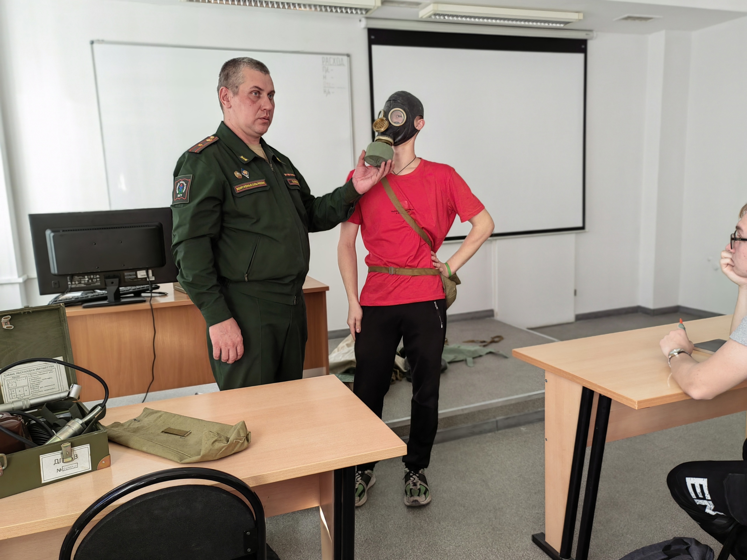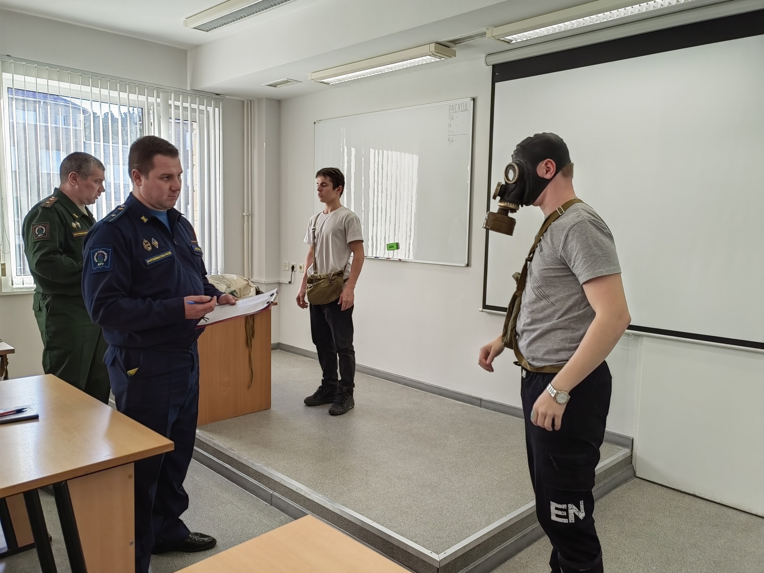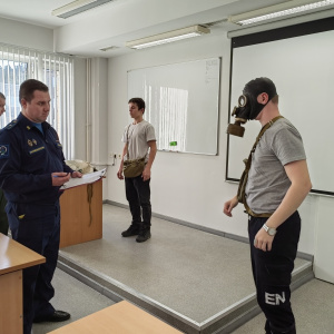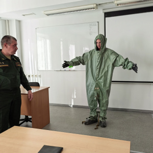 После обеда на занятии по радиационной, химической и биологической защите курсанты примерили общевойсковой защитный костюм (ОЗК), после чего прошла сдача нормативов по надеванию противогаза, с которой все успешно справились.